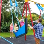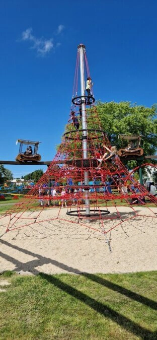 Ältere Kinder vergnügen sich auf dem großen Spielplatz mit Spielgeräten, die anspruchsvoller sind. Zum Beispiel können sie sich im Toffe Tower hochziehen oder sich selbst und andere auf dem Hindernislauf herausfordern.