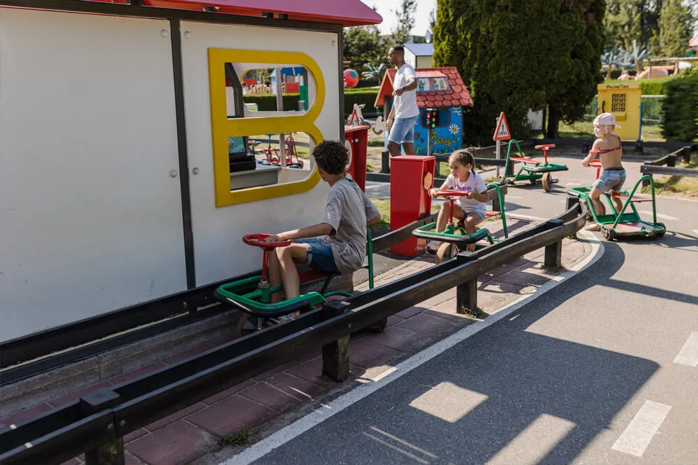 In the traffic garden of Linnaeushof children up to 7 years old can playfully learn how to behave in traffic. With a tricycle, they cycle over the small roads, with zebra crossings, traffic lights, a roundabout and traffic signs that indicate the rules. Some tricycles are thematised as a imaginary police car or fire engine. This is especially fun for children who like to play role plays and dream of becoming a policeman or fireman or firewoman later when they grow up. An extra nice addition is Bennie’s Burger restaurant. A toy-restaurant with a real drive-in.