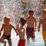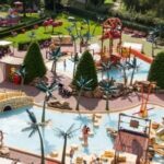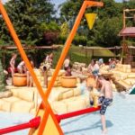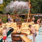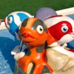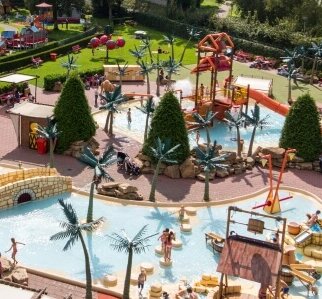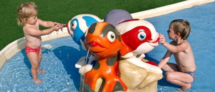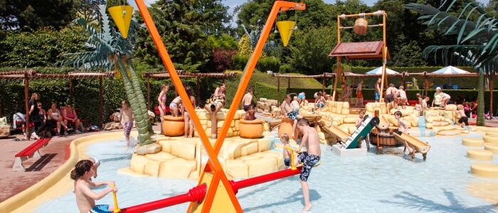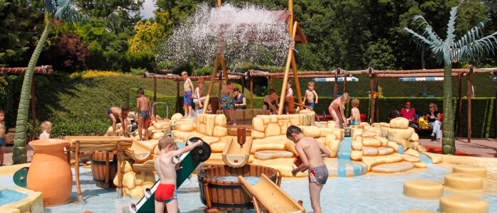 Geen zwembad, maar een echte waterspeeltuin waarin je actief kunt spelen met alles waar water uitkomt en water in moet! Van alle kanten krijgen de spetters je te pakken. Kies jij voor één van de glijbanen of durf jij onder een enorme emmer te blijven staan die zich op onverwachte momenten leegt? Draai zelf aan de verschillende kranen waarmee jij bepaalt uit welke pijpen het water komt stromen. De waterspeeltuin biedt heerlijke verkoeling tijdens het warme weer van de zomerdagen. Met rondom grote palmbomen en levensgrote dromedarissen waan je je echt in een oase.